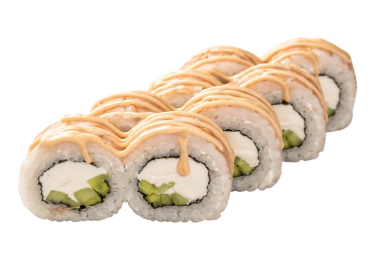 Тигровая креветка, творожный сыр, огурец, рис, нори, соус спайси