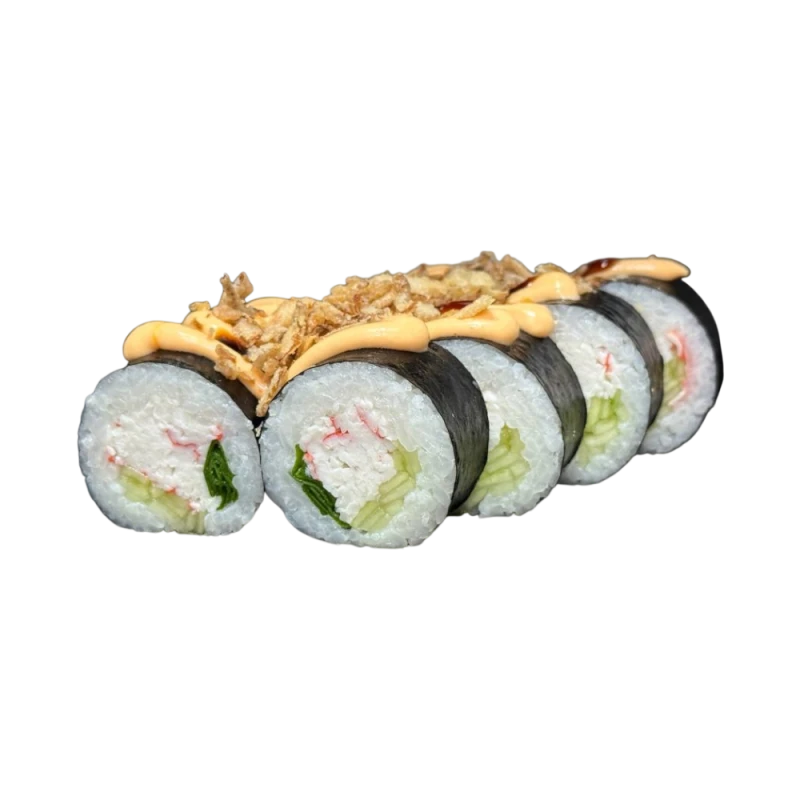 Снежный краб, огурец, лук зелёный, соус Спайси, соус Унаги, криспи лук, рис, нори