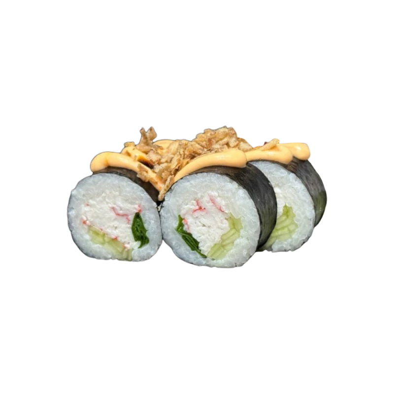 Снежный краб, огурец, лук зелёный, соус Спайси, соус Унаги, криспи лук, рис, нори
